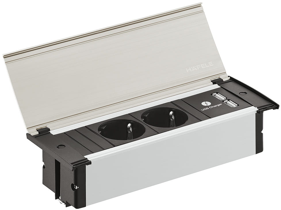 Gniazdo wielopunktowe KAPSA S, wersja F(DE), 2 gniazda + 2x USB 5V/max. 2,4A, k.STAL NIERDZEWNA HÄFELE 822.92.061
