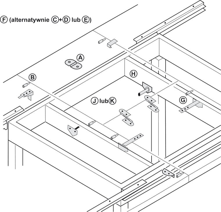 ⓐ uchwyt płyty ⓑ kołek prowadzący ⓒ hak zamykający 52 mm ⓓ hak zamykający 53 mm ⓔ zasuwka obrotowa 48 mm ⓕ zasuwka obrotowa 60 mm | ⓖ zapinka (alternatywnie ⓒ+ⓓ, ⓔ,ⓕ lub ⓗ) ⓗ zapinka z blokadą ⓘ uchwyt z czopem ⓙ kątownik wsporczy ⓚ zawias do stołów rozkładanych ⓛ zawias do stołów rozkładanych |