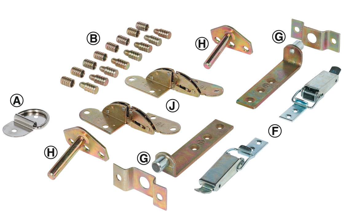 ⓐ uchwyt płyty ⓑ kołek prowadzący ⓒ hak zamykający 52 mm ⓓ hak zamykający 53 mm ⓔ zasuwka obrotowa 48 mm ⓕ zasuwka obrotowa 60 mm | ⓖ zapinka (alternatywnie ⓒ+ⓓ, ⓔ,ⓕ lub ⓗ) ⓗ zapinka z blokadą ⓘ uchwyt z czopem ⓙ kątownik wsporczy ⓚ zawias do stołów rozkładanych ⓛ zawias do stołów rozkładanych |