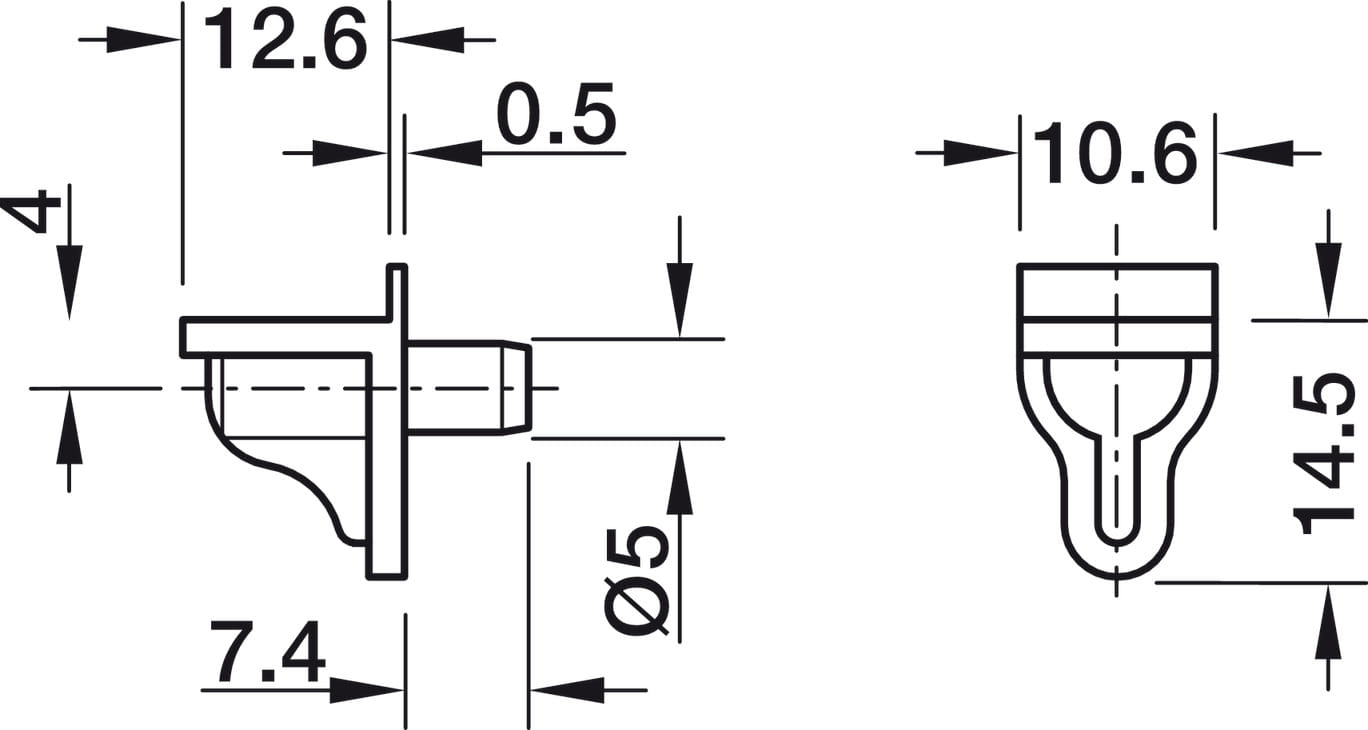 Podpórki półek drewnianych lub szklanych, do osadzania w otworach o średnicy 5 mm, tworzywo sztuczne z trzpieniem stalowym.