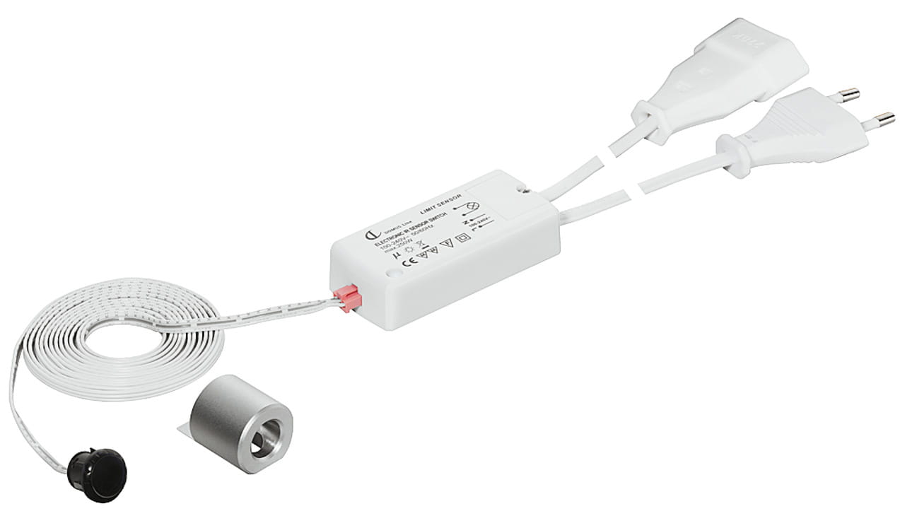 1 urządzenie sterujące z przełącznikiem sensorowym, przewodem zasilającym 1,8 m z wtyczką płaską typu Euro, przewodem łączącym 0,5 m ze złączem płaskim typu Euro i przewodem czujnika 2 m, obudowa czujnika
