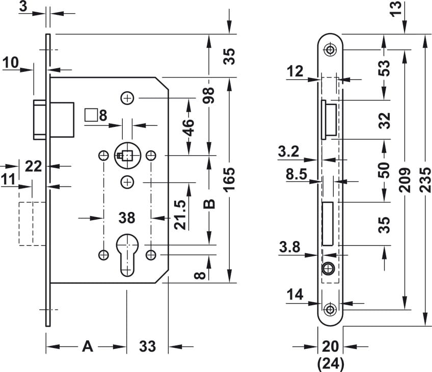 Zamek mechaniczny BMH A=55 mm "NA WKŁADKĘ" PRAWE DIN, STAL NIERDZEWNA Häfele 911.04.689