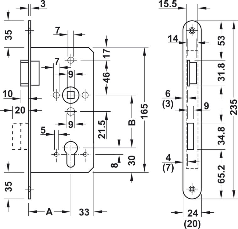 Zamek mechaniczny BMH A=65 mm "NA WKŁADKĘ" LEWE DIN, STAL NIERDZEWNA Häfele 911.55.078